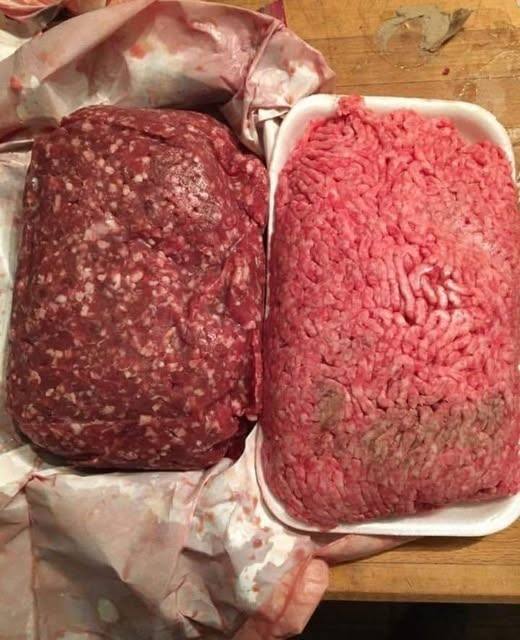 Know what you’re buying. This picture below shows store-bought beef (on the right) and farm-raised beef (on the left)